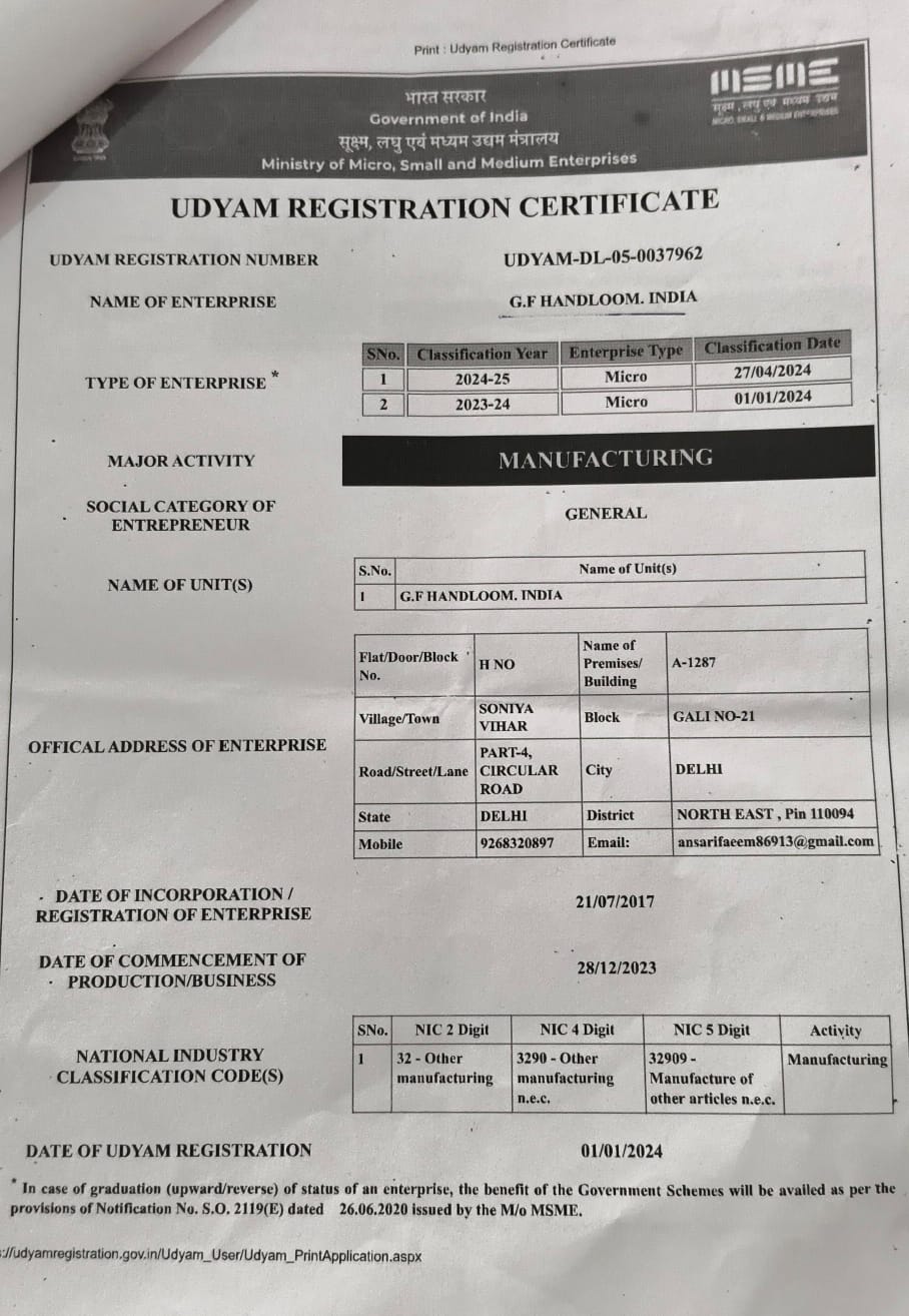 G F HANDLOOM INDIA PROPRITER RUKSANA WARIS